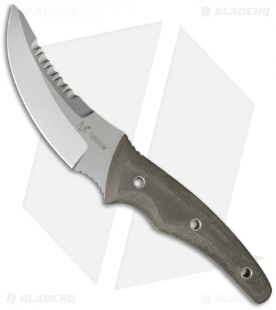 Designed by Alessandro Zanin, the Recon is a standout fixed blade knife from Fox Knives military division. The long, upswept primary cutting edge and serrated upper grind are geared toward close quarters combat techniques. Its Bohler N690 steel blade is full-tang and bead blast finished. OD green canvas Micarta scales offer comfort and reliable grip.
