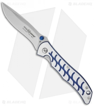 The Fox Terzuola is a sleek folder with Bob Terzuola’s signature style. The 440C stainless steel drop point blade has a bead blast finish and recurve profile. The two-tone finished aluminum handle has satin faces and is blue anodized everywhere else. The Fox Terzuola has a nested liner lock tab and a polished pocket clip.