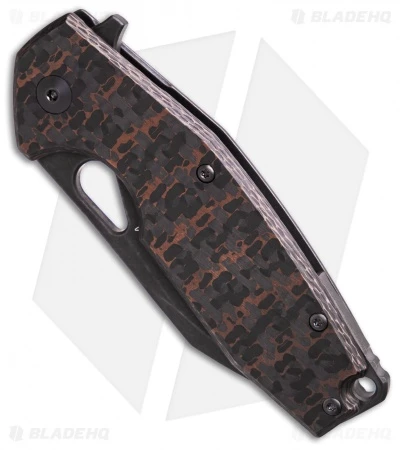 - Snakeskin carbon fiber and copper composite handle and a PVD titanium frame lock.